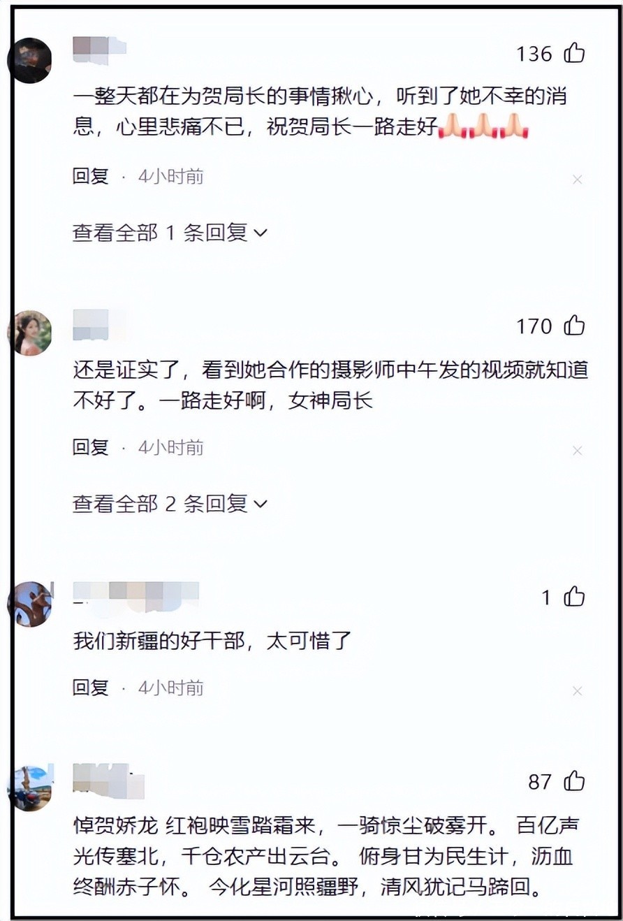 贺娇龙女士,一路走好,大家不会忘记你,相信在你的影响下,会有更多的人为新疆的发展贡献自己的一份力量。