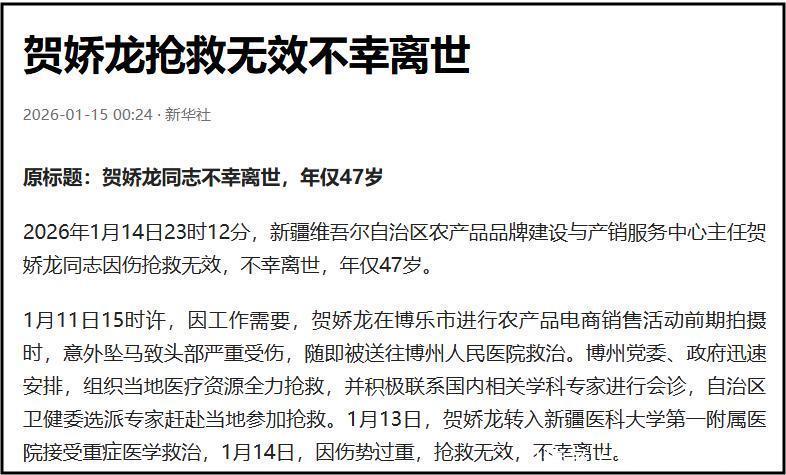 1月15日凌晨,新华社发文官宣了贺娇龙离世的消息。